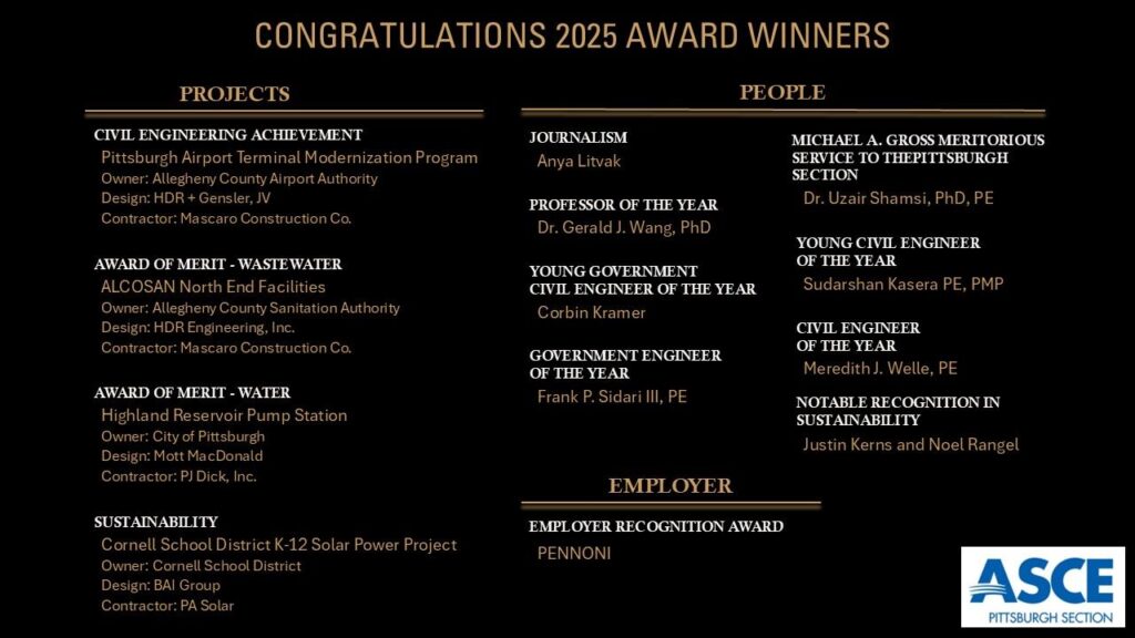 We’re proud to help advance sustainable infrastructure that benefits students, communities, and the environment. Awardees will be honored at the 2026 Engineers’ Week Awards Banquet on February 28 at the Engineers’ Society of Western Pennsylvania.